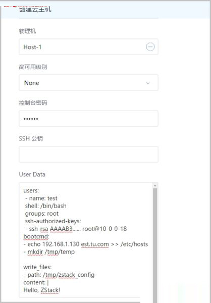 ZStack 2.1 支持在创建云主机时导入User Data(用户自定义数据),通过用户上传的自定义参数或脚本,云主机可以进行定制化配置或完成特定任务。
