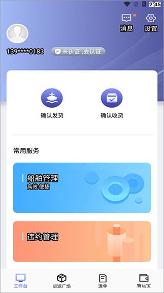 3、在首页工作台中查看确认收发货信息,船舶管理,违约管理;