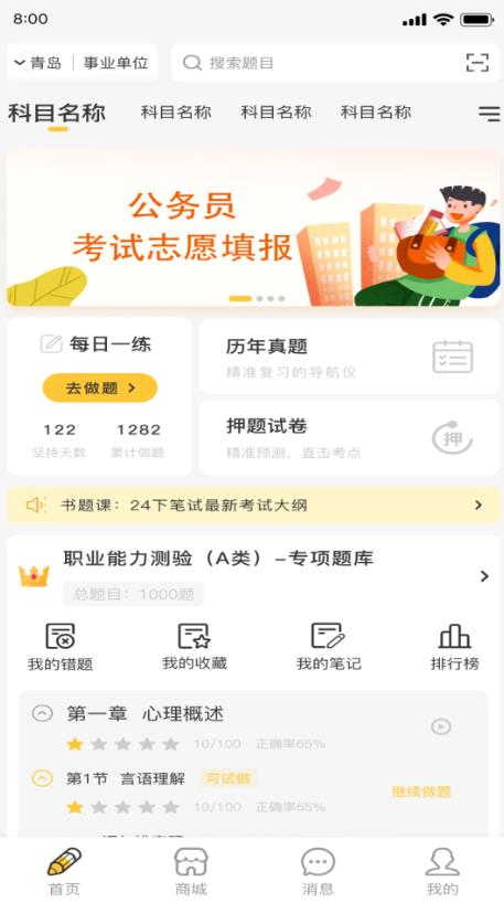 智能做题根据目标考试的考点,考频,难度,用人工智能算法实现一对一智能出题,通过记录用户练习情况,完成智能能力评估,还有针对薄弱项的专项练习、强化练习。