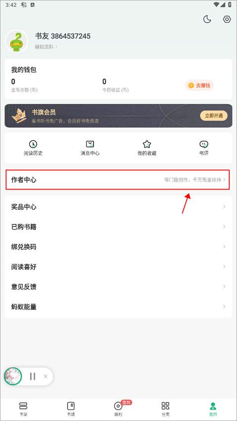 1、书旗小说可以在手机和电脑上都可以写作,简单方便,首先手机下载书旗小说app并注册进入,进入后在我的界面点击“作者中心”