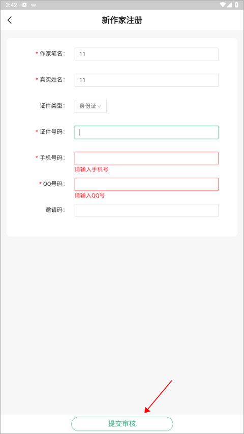 3、在新作家创作界面,输入你的笔名、真实姓名、身份信息、手机号码等信息后,点击“提交审核”审核通过即可。