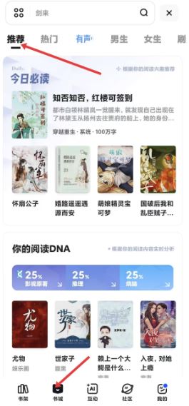 2、书城推荐页,搜索栏可查书籍,今日必读依兴趣推书,阅读DNA实时分析阅读偏好,陈列影视原著等分类书籍,书架书城等功能栏便捷切换。