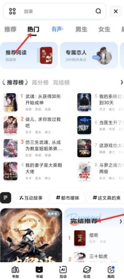 3、书城热门页,推荐阅读、专属恋人板块醒目,推荐榜列高分小说,下方设互动故事等话题分类,有声书与完结推荐丰富阅读选择,满足多元需求。