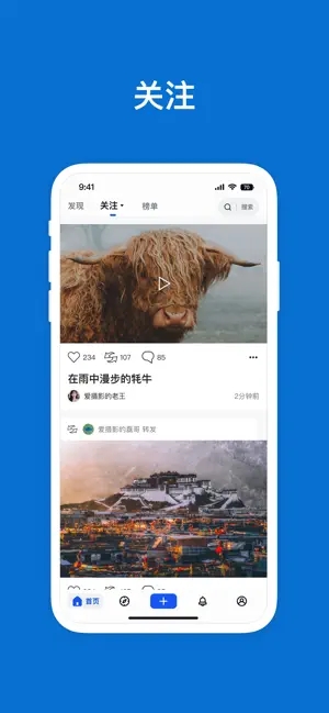1、首页关注,聚焦你的关注,不错过任何一张好友的作品和转发。