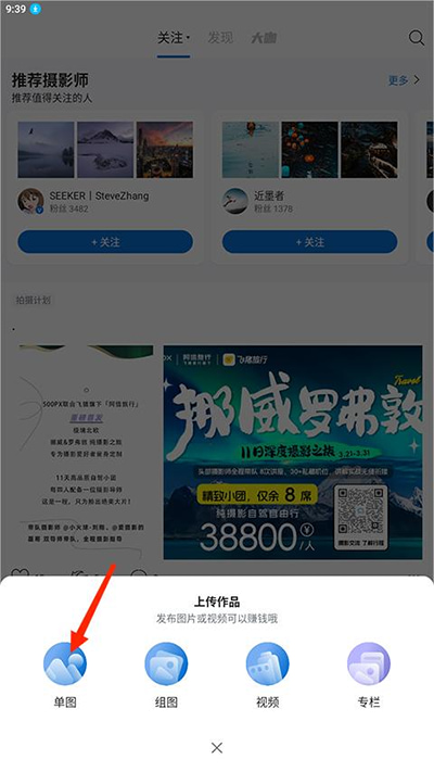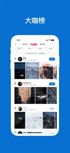 在社区可以创建属于自己的个人摄影师主页,展示自己的摄影作品,单图、影集、图文,为每位摄影师建立属于自己的个人品牌。