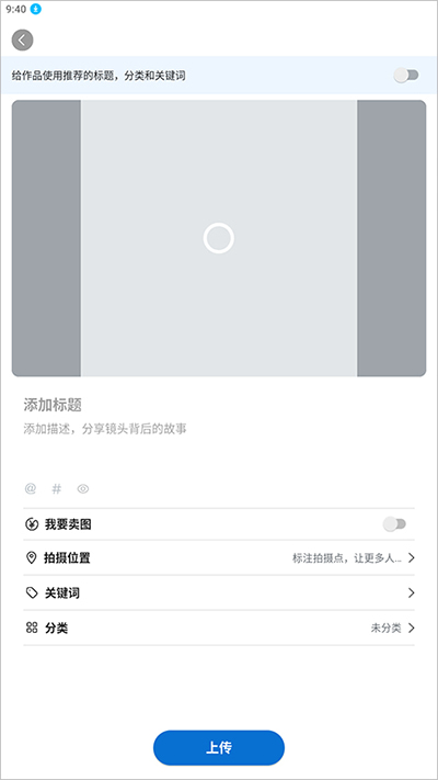 4、最后在作品上传界面中将作品标题、描述、分类等完善后,将我要卖图功能开启。提交后就可以等待卖家购买啦!