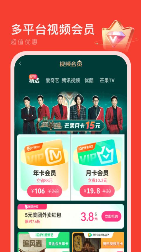 提供视频、音乐、网盘等各类数字会员的优惠购买渠道,部分支持折扣充值,支付后权益秒到账。