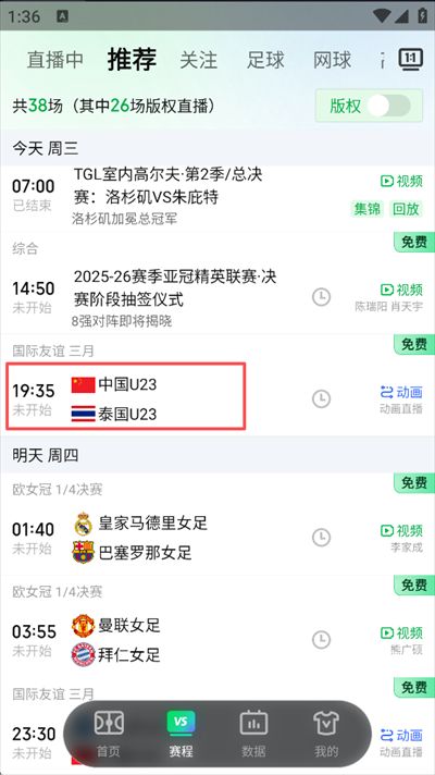 2、找到目标比赛,在赛程列表中,找到 「中国 U23 vs 泰国 U23」 这场比赛。