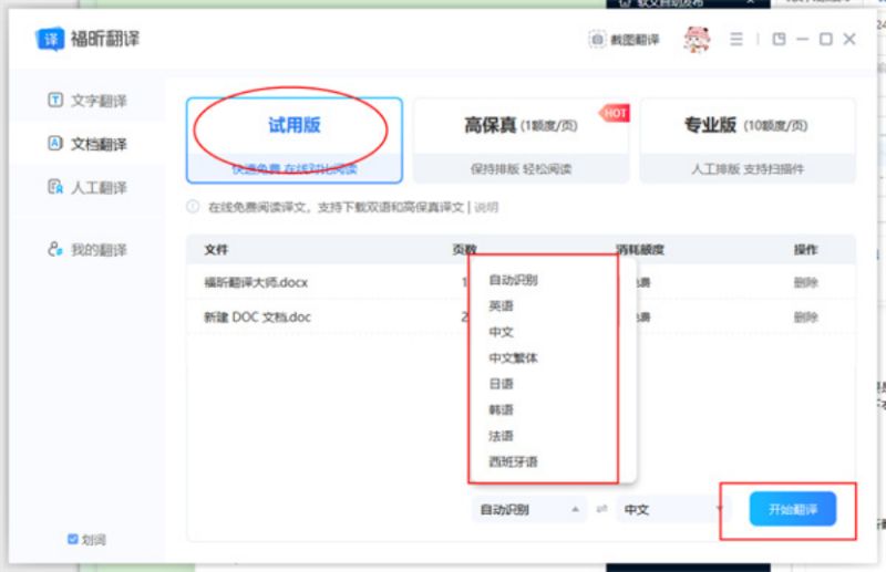 3、然后,你要是想免费试试,就点一下上面的【试用版】按钮,如果你想设置翻译成哪种语言,就点一下下面的【自动识别】按钮,设置好之后,点一下右下角的开始翻译按钮就可以了。