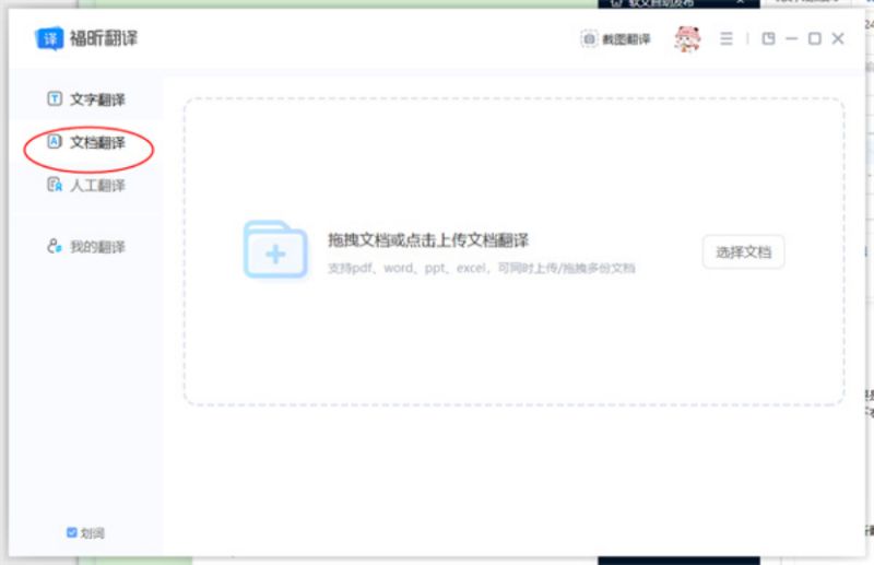 2、接下来,点一下右边的空白地方,然后从你的电脑里选中你想翻译的文件,福昕大师支持很多种文件格式,比如pdf、word、ppt、excel,而且还能一次上传好几个文件。