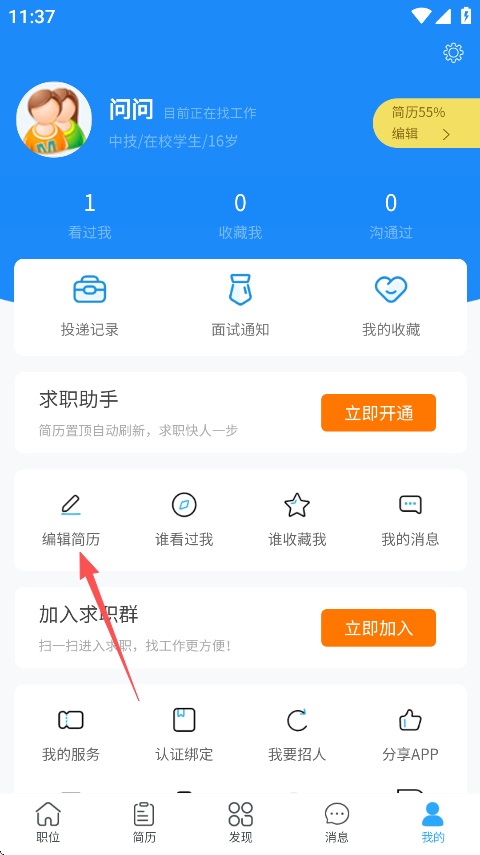 6、点击我的,里面提供编辑简历、我的 服务、我要招人、投递记录、面试通知等信息。
