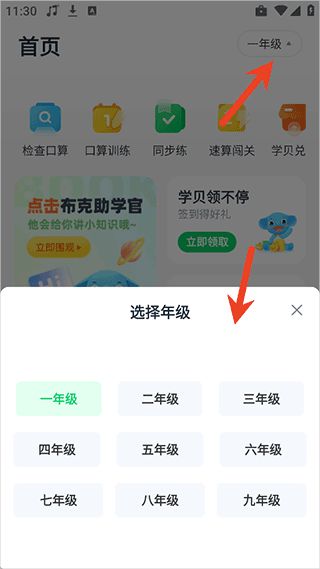 1、小盒素养app提供了多样的练习方式,首先在【首页】的右上角更换孩子的年级,一共就九个年级可以选择。