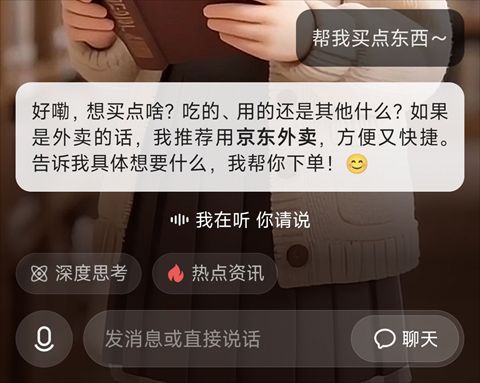 京东生态全打通:东东为你打造一站式便捷生活解决方案。点外卖、买东西,只需告诉东东,它会为你智能挑选,一键下单,省心省力送货到家!从此,聊聊天就能把生活安排得井井有条。