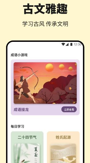 应用页面古朴,采用简单整齐的布局风格,方便用户进行观看,沉浸式学习;