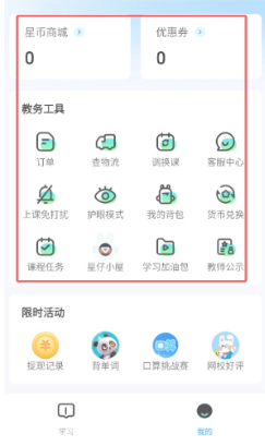 4、进入个人页面后,可使用教务工具(订单查询、物流跟踪、调课申请、护眼模式等)。