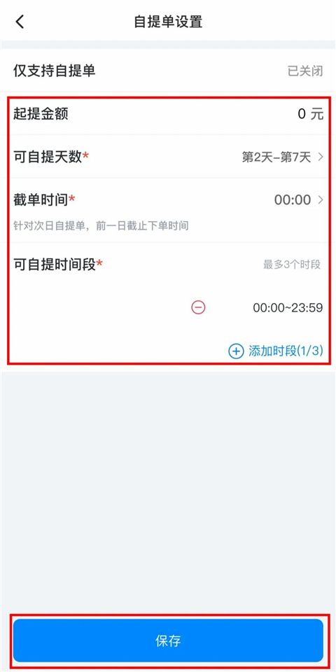 5、设置自提单的金额以及天数等,点击【保存】即可。