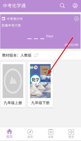 1、进入中考化学通首页,能看到中考倒计时,教材版本默认为人教版,可选择九年级下册教材封面,点击后进入对应的学习内容页面。