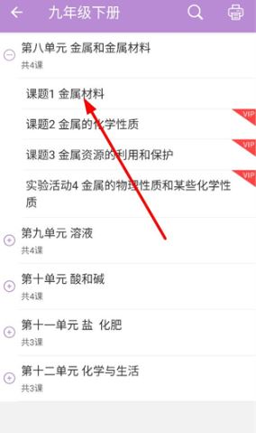 2、进入九年级下册页面,会显示多个单元分类,每个单元包含对应课题,可选择第八单元下的课题1金属材料,进入该课题的学习界面。