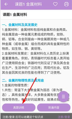 3、进入课题1金属材料页面,可查看该课题的知识点讲解,包含金属材料分类等内容,还能点击真题训练按钮,进入对应的练习页面。