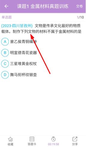 4、进入课题1金属材料真题训练页面,会呈现中考单选题型的题目,可进行答题,页面有答题卡、计时功能,完成后可点击交卷提交作答。