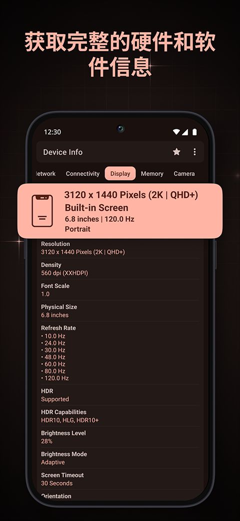 6、显示:分辨率、密度、字体比例、物理尺寸、支持的刷新率、HDR、HDR功能、亮度级别和模式、屏幕超时、方向