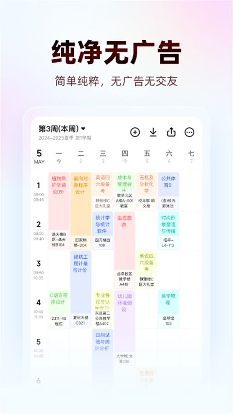 3、简洁轻巧,没有广告不臃肿耗电少无后台,启动速度极快,生成课表后即点即看;