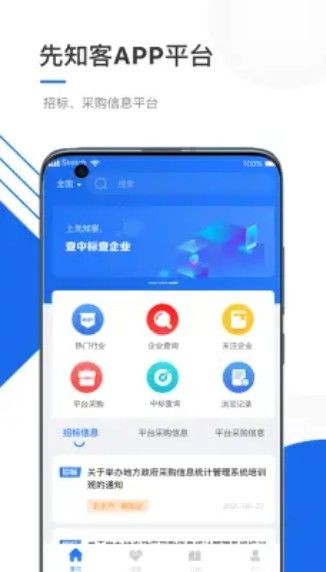 1、可以搜索全国各个城市的热门行业、企业查询、关注企业、中标查询,查看平台采购等信息;