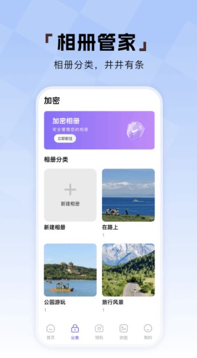 可一键创建加密相册,自由设置密码保护重要隐私照片,可自由导入图片保存;