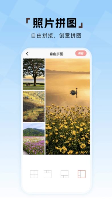 强大的照片自由拼图功能,导入多张图片就能自定义排序拼图,并能一键保存;