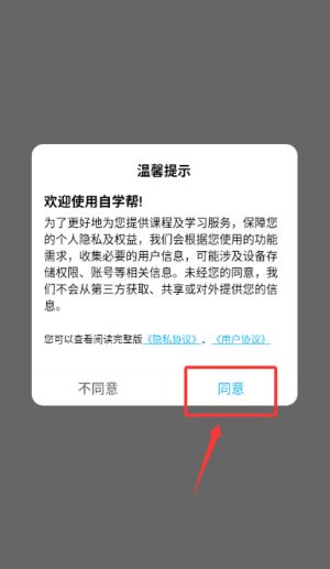 1、在自学帮中点击"同意"温馨提示,进入应用首页。