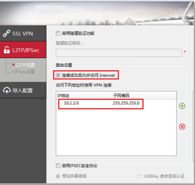 L2TP over IPSec隧道分离有两种配置方式,采用哪种方式取决于连接中的路由设置: