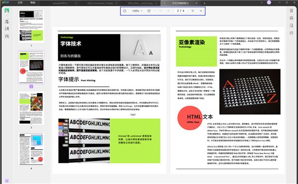 UPDF的阅读体验就像他的界面风格一样格外清新,只需拖拽 PDF 文档到软件中即可打开阅读,即使是打开一个1G以上的超大文档,也很丝滑流畅,不会卡顿这样的情况,阅读体验甚至比Adobe还好。通过关键词搜索即可快速找到你要阅读的内容,四种不同的阅读模式让用户自由选择。它采用了浏览器的标签的形式,可以同时打开多个PDF文件操作,UPDF独有的幻灯片播放模式,让用户可选择直接播放或以演讲者模式播放内容。