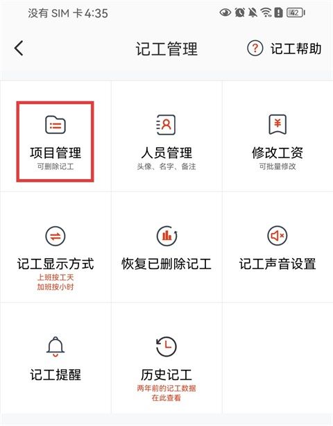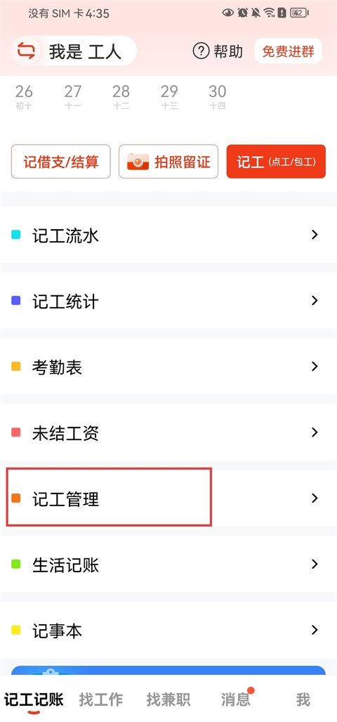 1、打开记工记账app,首页下滑并选择【记工管理】选项;