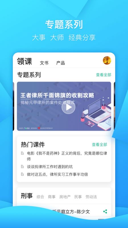 针对法律工作者成长缓慢、效率低下,不善时间管理、团队管理、案件管理、客户管理、知识管理等痛点,领络自主研发、专业打造了这一款集云端办公、无边界协作、交流社区、搜索计算、知识市场等多功能于一体的专业法律科技产品——领络。