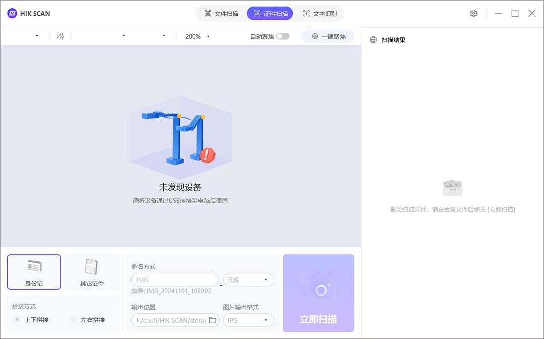 1、本站下载并安装海康高拍仪助手,用USB数据线将高拍仪连接到电脑的USB口。