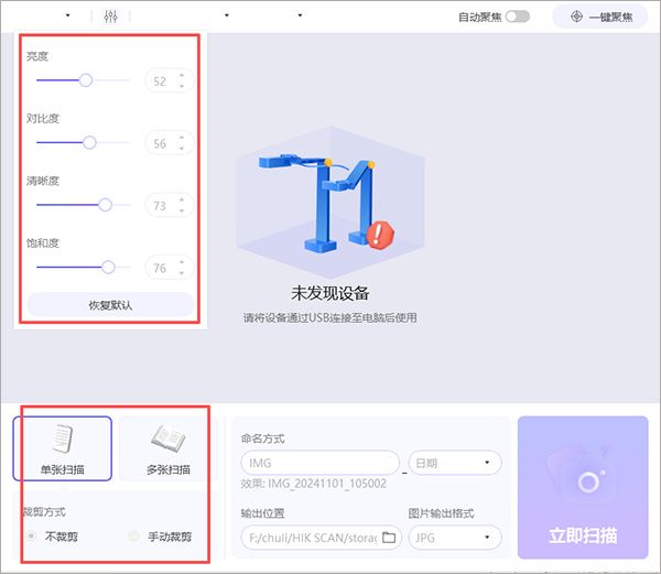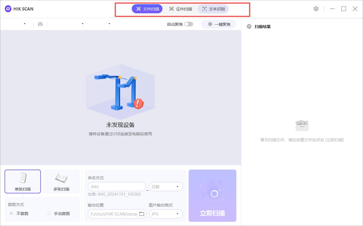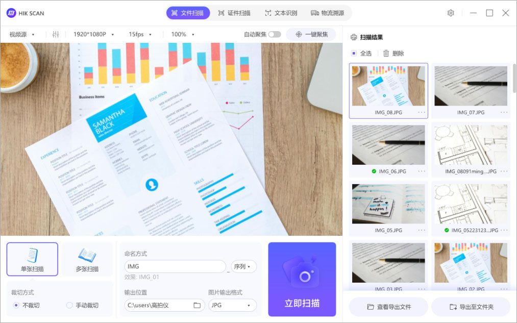 海康高拍仪助手(HIK SCAN)是由海康威视推出的一款文件资料电子化工具,可搭配海康桌面智能高拍仪使用。基于强大的硬件适配能力,海康高拍仪助手可支持文件扫描、证件扫描、文本识别等多种功能,用户可以手动选择识别区域,精准识别并转换,还提供多种扫描模式,大大节省用户扫描时间。此外,海康高拍仪助手界面设计简洁,使用方便,可适用于行政财务、教辅教学、企业研发、工厂产线等多种场景,满足不同用户的使用需求。