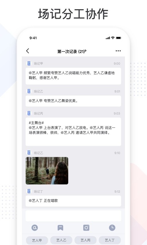 录并与素材同步;用户可以根据需要添加标签,修改场记,切换项目,查看通告单等等。