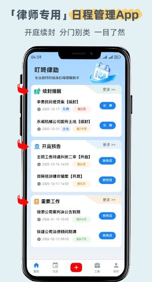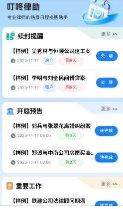 叮咚律助app是一款专为用户提供工作日程管理提醒的工具软件,软件主要助力律师用户来实时管理自己的日程,更好助力用户的法律工作,轻松高效的提醒,便捷把握关键时间点,从而可以实现续封提醒,自动跟踪并提醒用户的财产保日期,以此来实时提醒用户。