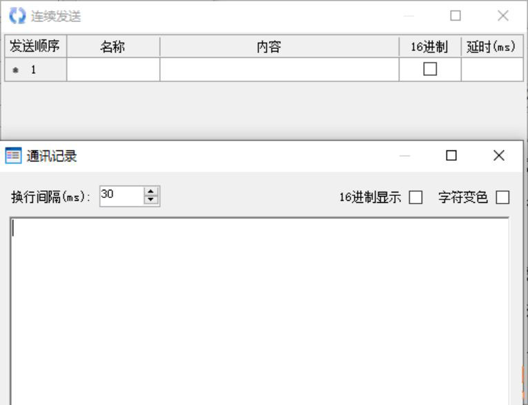 5、连续发送的界面如图所示,可以将多个指令快速发送,可以在软件查看通讯记录