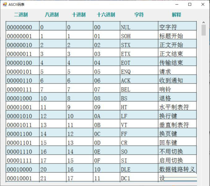6、ASCII码表界面如图所示,可以在软件显示二进制、十进制相关的字符和解释