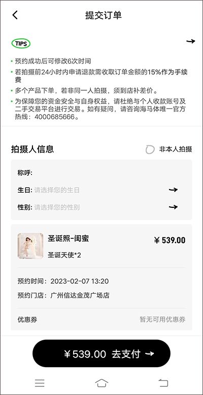 5、在【提交订单】页面,核实拍摄人信息,确认无误后,点击【去支付】即可完成拍照预约。