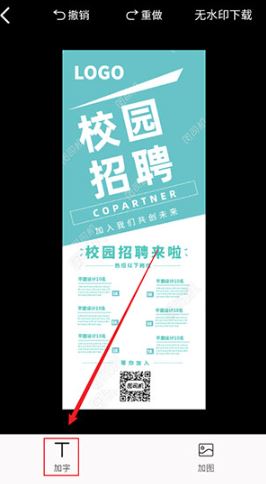 2、进入模板编辑页面,点击底部的加字选项;