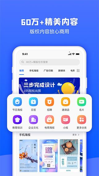 2、可以随时随地做设计,简单3步即刻生成海报,各种类型的素材一应俱全;