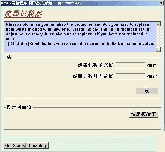 3、点下“读”,就可以读出废墨计数器的当前值,点下下面的“设定初始值”就可以恢复到出厂设置了。
