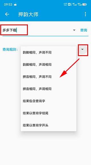 返回主页,点击查询规则的下拉可切换不同的韵脚分类