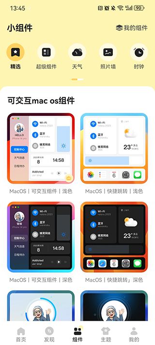 用户进入组件页面,可以设置精选、超级、天气等组件,而且还有可交互的mac os组件可以进行设置。