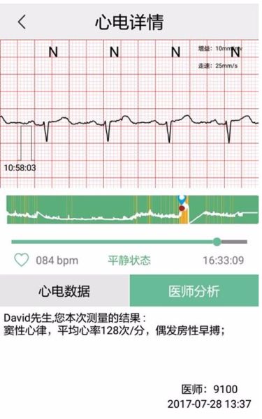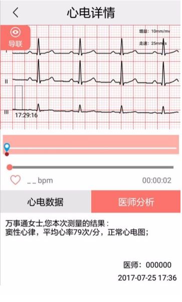 3、测量完成后,进入心电详情页,查看心电数据,也可查看医师分析结果。