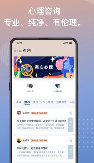 有心心理app是为各位用户打造的专业心理健康服务软件,权威的心理咨询师在线为你提供服务,帮助你解决各种心理问题,释放压力,对每个用户所提的问题以及私人隐私都将不会被公开,让每个有心理问题的网友都能迅速调整自己的心态,迅速康复。
