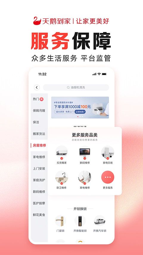 天鹅到家极速版前身58到家,它是一款生活服务类app,通过它能够让你轻松享受各种优质的生活服务,从衣食住行到美云学,多种多样的服务让你足不出户,享受便利生活。目前已经覆盖了北上广深等30余个城市,为用户提供超高质量的生活服务。