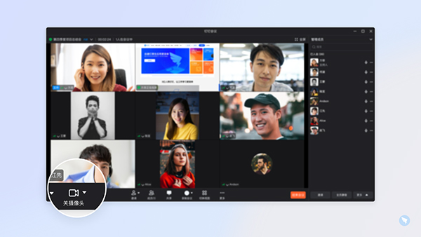 2、会议开始后:会议进行界面-单击左下角开关摄像头图标-选择开启/关闭摄像头。
